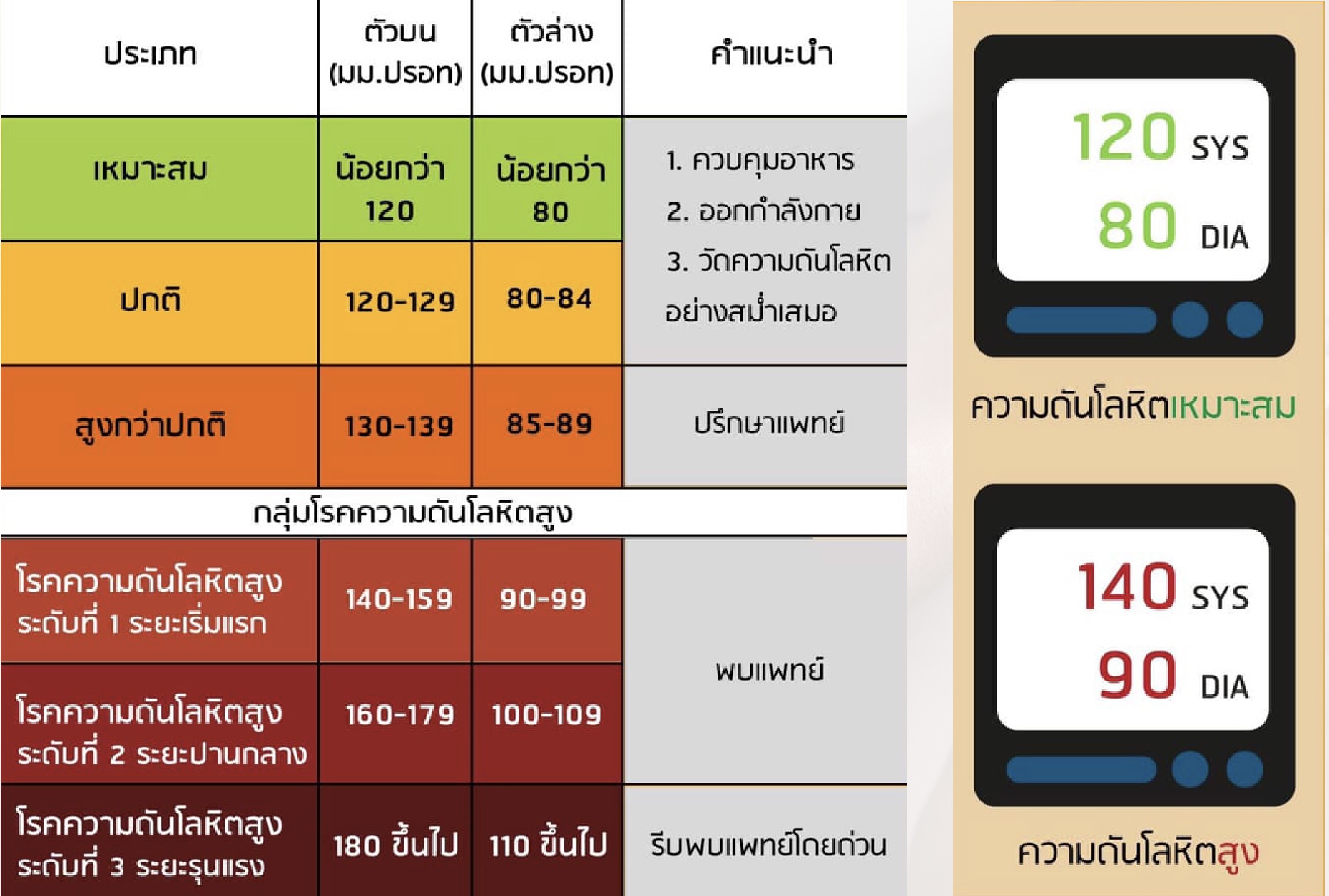 - ผู้ใหญ่อายุ 18 ปีขึ้นไป ค่าความดันโลหิตไม่ควรเกิน 130/85 มิลลิเมตรปรอท